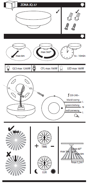 Pohybový senzor nie je vhodný pre spínanie úsporných žiarivkových svetelných zdrojov.