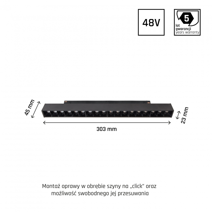 SYSTEM SHIFT - lištové svietidlo GRID M, výkon 17 W, vysoká svetelná účinnosť 100 lm/W. Je vyrobený z kvalitných komponentov, s 5 ročnou zárukou. Má tiež veľmi vysoký index podania farieb RA>90. Svieti teplým svetlom (3000K), ktoré podporuje relaxáciu a odpočinok, vďaka čomu je osvetlená miestnosť útulnejšia. Úzky 35° uhol vyžarovania poskytuje smerové svetlo, čo vám umožní lepšie zvýrazniť vybrané objekty alebo povrchy. Určené pre montáž na koľajnicu.