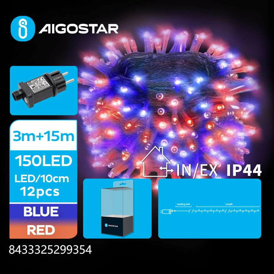 LED Vianočné osvetlenie - reťaz, 150 diód, 15m, IP44, 230V - Modrá-Červená - 8 módov svietenia
