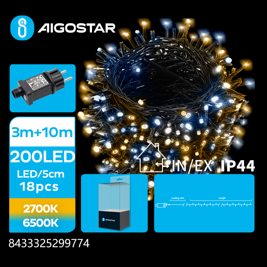 LED Vianočné osvetlenie - reťaz, 200 diód, 10m, IP44, 230V - Teplá biela+Studená biela - 8 módov svietenia