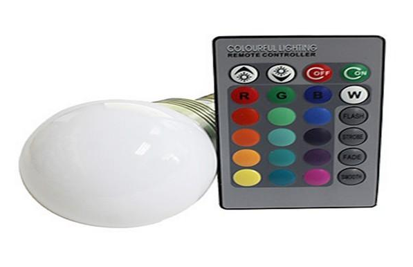 RGB LED žiarovka E27 s príkonom 5W . Pomocou diaľkového ovládača, ktorý je súčasťou balenia môžete meniť farbu svetla žiarovky. Možný výber medzi 16 farbami , 4 svetelnými efektmi FLASH (prepínanie farieb striedané s plynulým prechodom cez 8 farieb), STROBE (prepínanie farieb s 1 sekundovým intervalom), FADE (plynulý prechod cez spektrum farieb), SMOOTH (pomalý plynulý prechod cez spektrum farieb) a zmeny intenzity svetla. Infračervené spojenie s maximálnou prevádzkovou vzdialenosťou 5m. Jeden ovládač je možné použiť aj na ovládanie viacerých RGB LED žiaroviek súčasne.