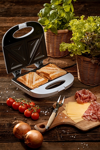 Praktický sendvičovač s výkonom 750 W. Umožňuje pripraviť 2 sendviče súčasne, ktoré sa rozdelia na 4 trojuholníkové kusy. Špeciálny povlak na vyhrievacích doskách zabraňuje prilepeniu, vďaka čomu sa zariadenie ľahko čistí. Termostat signalizuje, že platničky sú dostatočne nahriate a zaisťuje vhodnú teplotu počas celého procesu opekania. Vďaka tomu sú pripravené toasty chrumkavé a zlatisté.