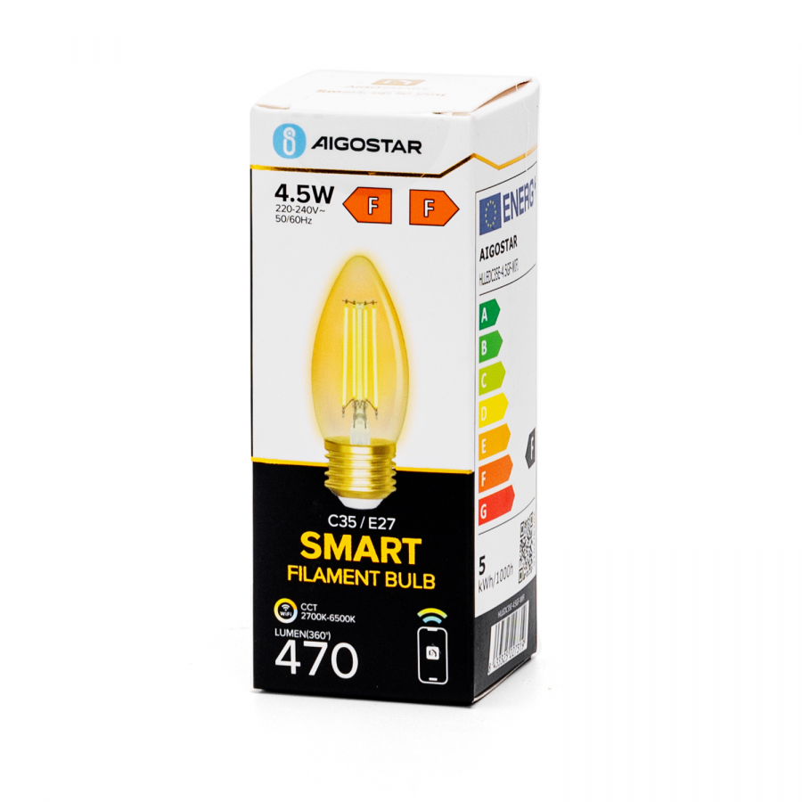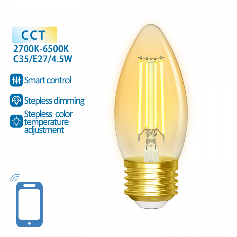 SMART LED žiarovka E27 4,5W/470lm , svieca C35 LED vlákno AMBER , CCT