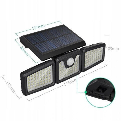 Lampa je vybavená snímačom pohybu a súmraku. Vďaka tomu ušetríte energiu naakumulovanú počas dňa a ešte viac predĺžite chod lampy na jedno nabitie. 270-stupňový uhol svietenia v kombinácii s dlhým dosahom snímača pohybu (7-8 metrov).Silný prúd svetla bez problémov zvládne osvetlenie dvora, chodníka či záhrady.