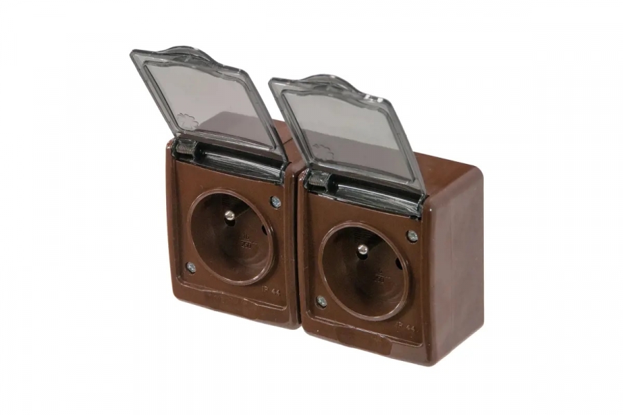 Vodeodolná dvojitá zásuvka na stenu 2x2P+Z , IP44 , dymový kryt, Hnedá