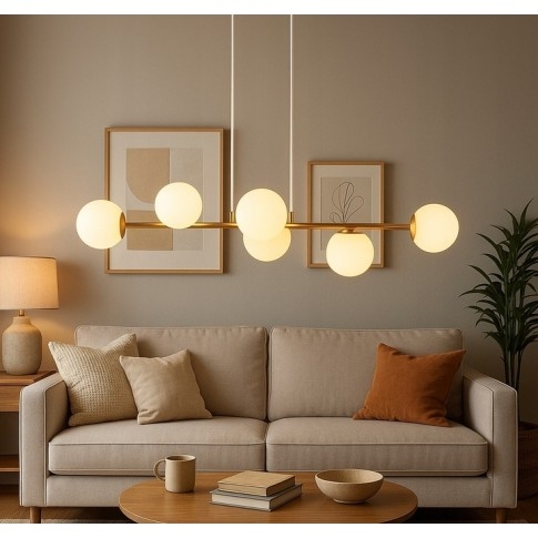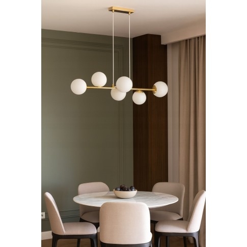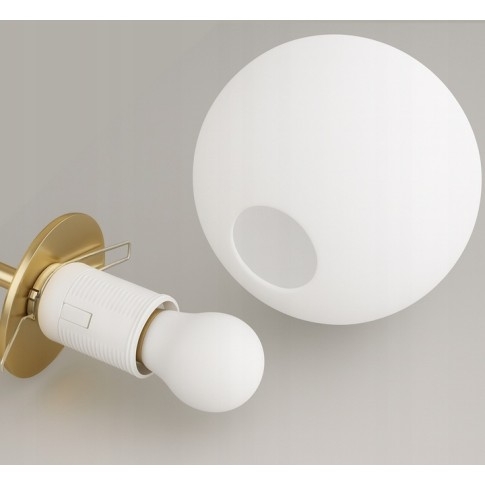 Jeho zlaté, saténové prevedenie a guľaté mliečnobiele tienidlá vytvárajú jedinečný efekt – ideálny do luxusných interiérov aj moderných bytov.